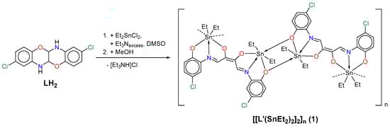 Upon the reaction of glyoxal-bis(2-hydroxy-5-chlorophenyl)imine LH2 with diethyltin dichloride in the presence of a base (Et3N) in DMSO, the 1D-coordination polymer 1 was obtained, in which formally the L’(SnEt2)2 fragment acts as a monomeric unit. It was