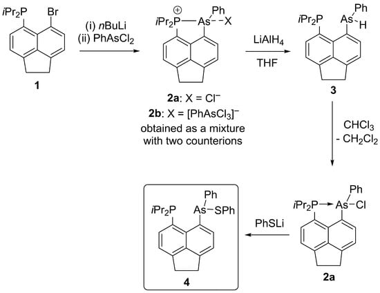 Peri-substituted bis(tertiary) phosphine-arsine Acenap(PiPr2)(As(SPh)Ph) (4, Acenap = acenaphthene-5,6-diyl) was synthesized by the reaction of the chloroarsine (PiPr2)(AsPhCl) with PhSLi. The X-ray crystal structure of this compound reveals an intramolecular P∙∙∙As–Cl pnictogen bond, with