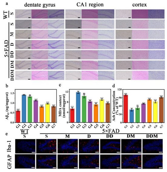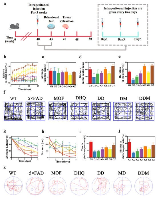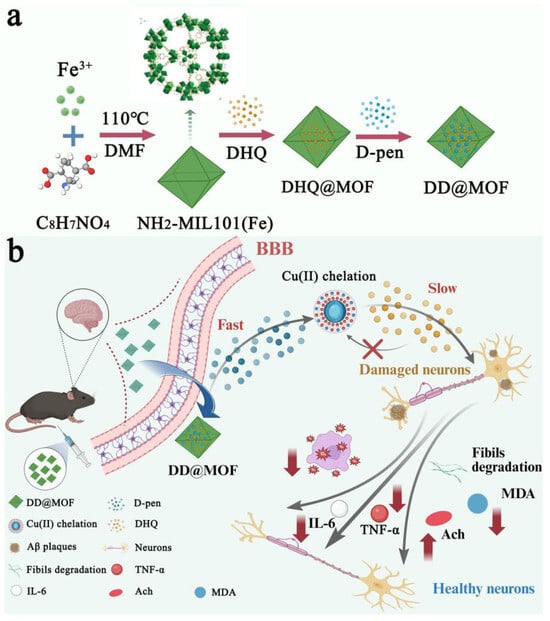 Polyphenols like dihydroquercetin, rutin, and rifampicin show promise for Alzheimer’s disease (AD) therapy due to their ability to inhibit amyloid-β (Aβ) aggregation and reduce reactive oxygen species (ROS), garnering significant recent interest. However, their efficacy is substantially diminished because excess metal ions present in amyloid plaques can chelate these compounds. Therefore, reshaping the metal microenvironment in the patient’s brain is particularly important for the therapeutic effect of AD. To address the above issues, we have constructed a composite system formed by NH2-MIL-101(Fe) (MOF), dihydroquercetin (DHQ), and D-penicillamine (D-pen). Due to the lack of π-π interaction and the low adsorption energy between D-pen/MOF, the release order and speed of D-pen was much faster than DHQ, thus achieving metal microenvironment regulation and ensuring the therapeutic effect of DHQ. In a 5 × FAD transgenic mouse model, DD@MOF treated and improved spatial learning and memory deficits. Therefore, the DD@MOF based on polyphenolic compounds provides a potential research direction for intervention in Alzheimer’s disease through chelating copper ions and antioxidant properties.
