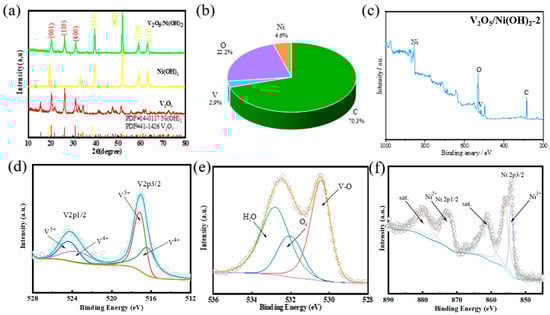 To optimize the electrocatalytic reaction process through the synergistic effects of V and Ni, this study employed a two-step hydrothermal method to successfully construct a V2O5 composite structure grown on a Ni(OH)2 substrate (denoted V2O5/Ni(OH)