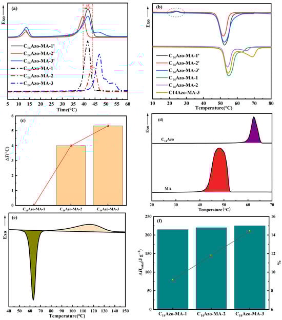 Organic phase change materials (OPCMs) show immense application potential in solar energy storages owing to high energy storage capacity and latent heat efficiency. However, it is difficult to achieve prolonged energy storage due to the sensitivity of phase change to environmental temperature, and adding other substances will lead to a decrease in total energy density. Herein, azobenzene organic phase change composite (C14Azo-MA) was designed and prepared by doping myristic acid (MA) with an azobenzene derivative (C14Azo) featuring a carbon chain identical to that of the MA matrix. C14Azo-MA was systematically characterized by UV–Visible absorption spectroscopy and differential scanning calorimetry. The results showed that the C14Azo-MA retains the same isomerization properties as the C14Azo dopant. C14Azo-MA, due to its molecular photoisomerization and enhanced intermolecular interactions, establishes a new energy barrier and forms supercooling within C14Azo-MA, thereby allowing the storage of thermal energy below the crystallization temperature of MA. Notably, the C14Azo-MA exhibits a high energy density of 225.08 J g−1, surpassing that of pure MA by 14.42%. This work holds significant potential for solar energy storage applications.