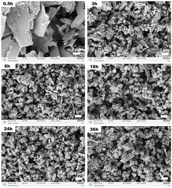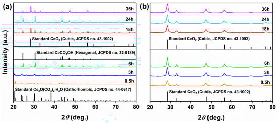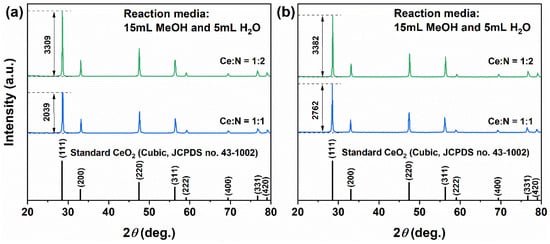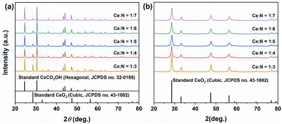 CeO2 is a crucial functional material in catalysis and energy applications, whose performance is highly morphology-dependent. Traditional synthesis methods often rely on organic templates or surfactants, which complicate the processes and pose environmental concerns. This study introduces an eco-friendly approach utilizing a methanol–water (MeOH-H2O) mixed solvent system combined with NH4HCO3 to achieve controllable synthesis of multi-morphology CeO2 without surfactants or templates. The effects of different solvent systems (pure H2O, pure MeOH, and their mixtures) and NH4HCO3 as an inexpensive regulator on precursor phase behavior and crystallization were systematically investigated. By optimizing the Ce:N molar ratios (1:1 to 1:7) as well as reaction times (0.5 to 36 h), our findings indicate that H2O significantly enhances crystallinity (from 40.9% to 61.4% for precursors, reaching 70.3% after calcination) and promotes octahedra formation in the MeOH-H2O mixed system, while NH4HCO3 acts as a structure-directing agent to control size (e.g., ~240 nm octahedra at Ce:N = 1:1, up to 375 nm at Ce:N = 1:2) and partially substitutes for high-temperature calcination in improving crystallinity. Variety morphologies, including plates, dendrites, octahedra, and hollow structures, were successfully synthesized. This work elucidates the synergistic mechanism by which solvents and NH4HCO3 influence CeO2 nucleation and growth, thereby providing an environmentally friendly synthesis route with significant potential applications in catalysis and energy storage.