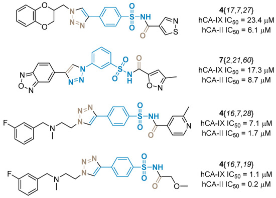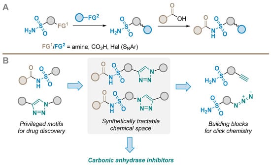 A synthetically accessible library of N-acyl sulfonamides was constructed using a combination of copper(I)-catalyzed azide–alkyne cycloaddition (CuAAC) and N-acylation of primary sulfonamides. The proposed two-step reaction sequence had a high experimentally confirmed synthetic success rate (up to 85%) and gave reasonable product yields (up to 61%). As a result of the validation process, a 262-member compound library (out of >70K accessible combinations) was prepared. Biological profiling of the synthesized library by differential scanning fluorimetry and enzymatic assays identified several low micromolar inhibitors of human carbonic anhydrase. The interaction of the discovered hits with the biological target was studied by docking and molecular dynamics.