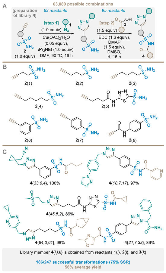 A synthetically accessible library of N-acyl sulfonamides was constructed using a combination of copper(I)-catalyzed azide–alkyne cycloaddition (CuAAC) and N-acylation of primary sulfonamides. The proposed two-step reaction sequence had a high experimentally confirmed synthetic success rate (up to 85%) and gave reasonable