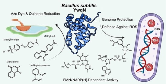 ywqN encodes a protein with an unassigned function that shares partial 3D homology with B. subtilis YhdA, Pseudomonas putida ChrR, and Escherichia coli YieF, which are NADP(H)/FMN-dependent oxidoreductases that catalyze the reduction of diverse chemical pollutants, including Cr(VI). Here, we report that a recombinant His6-YwqN protein displays marginal chromate reductase activity but is capable of reducing synthetic azo dyes. Remarkably, His6-YwqN exhibits a potent quinone reductase activity, catalyzing the reduction of menadione (MD) and 1,4-naphthoquinone (NQ). The individual and combined roles of YwqN and YhdA in protecting B. subtilis from ROS-promoting agents were further tested. Sensitization to the oxidizing agent H2O2 required the simultaneous loss of both YwqN and YhdA. In contrast, strains deficient in ywqN, either alone or in combination with yhdA, exhibited similar but higher susceptibilities to the superoxide-generating agent MD compared with the WT strain. These results indicate that YwqN and YhdA contribute to protection against the deleterious effects of ROS in B. subtilis. Further results revealed that while YwqN, but not YhdA, prevented MD-induced mutagenesis, both proteins synergistically prevented RifR mutations induced by H2O2. Furthermore, overexpression of YwqN suppressed the hypermutagenesis phenotype of a B. subtilis strain deficient in the prevention/repair oxidized guanine (GO) system, which is prone to accumulate 8-oxoGs. In summary, YwqN counteracts the cytotoxic and genotoxic effects promoted by ROS in B. subtilis and represents a potential tool for the remediation of soils and effluents contaminated with carcinogenic azo dyes.