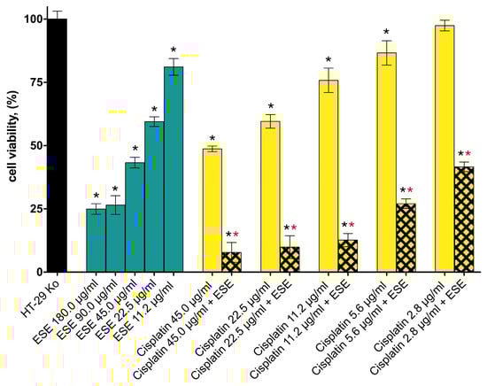 Resistance to apoptosis represents a major limitation of platinum-based chemotherapy in colorectal carcinoma, frequently arising from impaired p53 signaling and inefficient execution of programmed cell death. In this study, we investigated the anticancer activity of Erica spiculifolia extract (ESE) and its ability to synergistically enhance cisplatin cytotoxicity in HT-29 colorectal carcinoma cells. Cell viability was assessed using the MTT assay, followed by formal combination analysis based on the Chou–Talalay methodology. Combination experiments employed a non-constant ratio regimen in which a fixed ESE concentration (45 µg/mL) was combined with serial cisplatin dilutions (45.0–2.8 µg/mL) to define interaction behavior across multiple effect levels. Quantitative analysis revealed a strong superadditive effect, with Combination Index values well below 1 and markedly elevated Dose Reduction Indices for cisplatin, indicating substantial dose-sparing across effect levels. To elucidate the molecular basis of this synergism, apoptosis-related protein expression was profiled using a membrane-based immunoassay. Combined ESE and cisplatin treatment induced full-scale p53 reactivation, including restoration of phosphorylated p53 isoforms associated with DNA damage-dependent apoptotic signaling. Acridine orange/propidium iodide staining confirmed a pronounced increase in early and late apoptotic/necrotic cells following combination treatment. UHPLC-HRMS analysis identified kaempferol 3-O-glucoside (8830.19 ± 11.01 ng/mg dw) and myricitrin (3074 ± 3.12 ng/mg) as predominant flavonols, followed by naringenin 7-O-glucoside (5958.96 ± 9.98 ng/mg), while chlorogenic, cinnamic, quinic, and gallic acids were the main phenolic acids detected. These constituents may contribute to HT-29 cell sensitization to cisplatin.