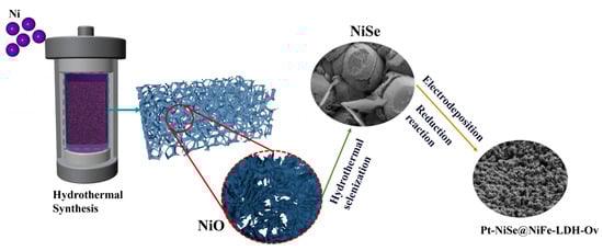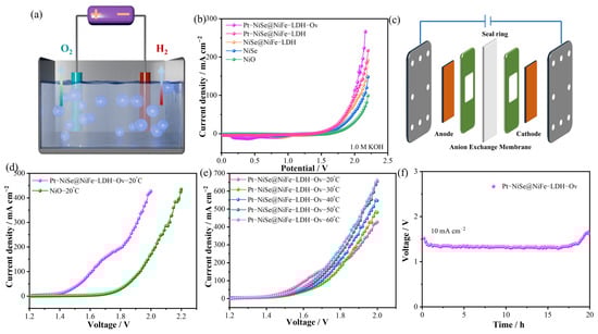 The escalating global energy crisis has intensified the demand for sustainable hydrogen production through electrochemical water splitting. Herein, we report a novel oxygen-vacancy-rich bifunctional electrocatalyst, Pt-NiSe@NiFe-LDH-Ov, synthesized via a facile electrodeposition and reduction method. It demonstrates exceptional performance, requiring low overpotentials of 280 mV for the HER and 344 mV for the OER to achieve current densities of 50 and 100 mA cm−2, respectively, in 1.0 M KOH. When employed for overall water splitting, the system requires a cell voltage of only 1.878 V to reach 50 mA cm−2. Notably, in an anion exchange membrane water electrolyzer (AEMWE), the performance shows significant enhancement with increasing operating temperature (20 to 60 °C), particularly at high current densities (>200 mA cm−2), highlighting its excellent thermal adaptability. The superior activity is attributed to the synergistic effect between the Pt-NiSe and NiFe-LDH interfaces and the abundant oxygen vacancies, which collectively enhance charge transfer and optimize the adsorption of reaction intermediates.
