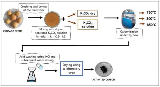 Activated biocarbons were synthesized from avocado seeds using potassium carbonate as an activating agent. The study aimed to evaluate K2CO3 as a greener and less corrosive alternative to KOH, traditionally used for producing porous carbons. Twelve samples were obtained under