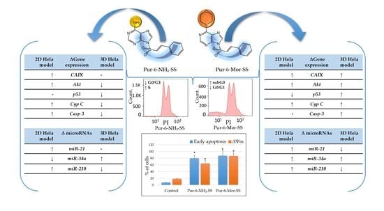 This study investigates two sulfonylpurine derivatives, Pur-6-NH2-SS and Pur-6-Mor-SS, which contain amino and morpholino substituents, for their anticancer potential in 2D and 3D models of human cervical adenocarcinoma (HeLa) cells. Cell cycle distribution, apoptosis, mitochondrial membrane potential, and ROS accumulation were evaluated by flow cytometry. Both Pur-6-NH2-SS and Pur-6-Mor-SS reduced the proportion of cells in the G0/G1 phase (to 39.65 ± 5.59% and 28.25 ± 1.20%, respectively) when compared with untreated cells. Pur-6-NH2-SS additionally increased the proportion of cells in the S phase (7.41 ± 0.32%), whereas Pur-6-Mor-SS increased the number of cells in subG0 (21.05 ± 6.15%). Additionally, Pur-6-NH2-SS triggered early apoptosis in 79.6 ± 8.5% of cells, accompanied by mitochondrial membrane depolarisation in 64.3 ± 9.0%. In comparison, Pur-6-Mor-SS elicited an even stronger apoptotic response, inducing early apoptosis in 87.4 ± 15.6% of cells and mitochondrial membrane potential disruption in 86.8 ± 9.0%, relative to untreated cells. RT-PCR analysis assessed the expression of key regulators, including miR-21, miR-210, and genes involved in survival and stress-response pathways (Akt, CAIX, caspase-3, and cytochrome C). In the 2D model, both derivatives increased CAIX, Akt, and Cyp C expression compared with untreated cells. In contrast, p53 expression remained unchanged in Pur-6-NH2-SS-treated cells and was slightly decreased in Pur-6-Mor-SS-treated cells. Casp3 expression was slightly elevated following Pur-6-NH2-SS treatment and remained nearly unchanged in Pur-6-Mor-SS-treated cells. In the 3D model, Pur-6-NH2-SS exerted a stronger inhibitory effect on CAIX, Akt, p53, Cyp C, and Casp3 expression than Pur-6-Mor-SS, which showed weaker inhibition overall. Both derivatives had a comparable impact on miR-21 and miR-210 expression in 2D and 3D HeLa models. These findings provide mechanistic insight into amino- and morpholino-substituted sulfonylpurine derivatives and highlight how 2D and 3D tumour models influence drug response, offering a basis for further development of purine-based anticancer agents.