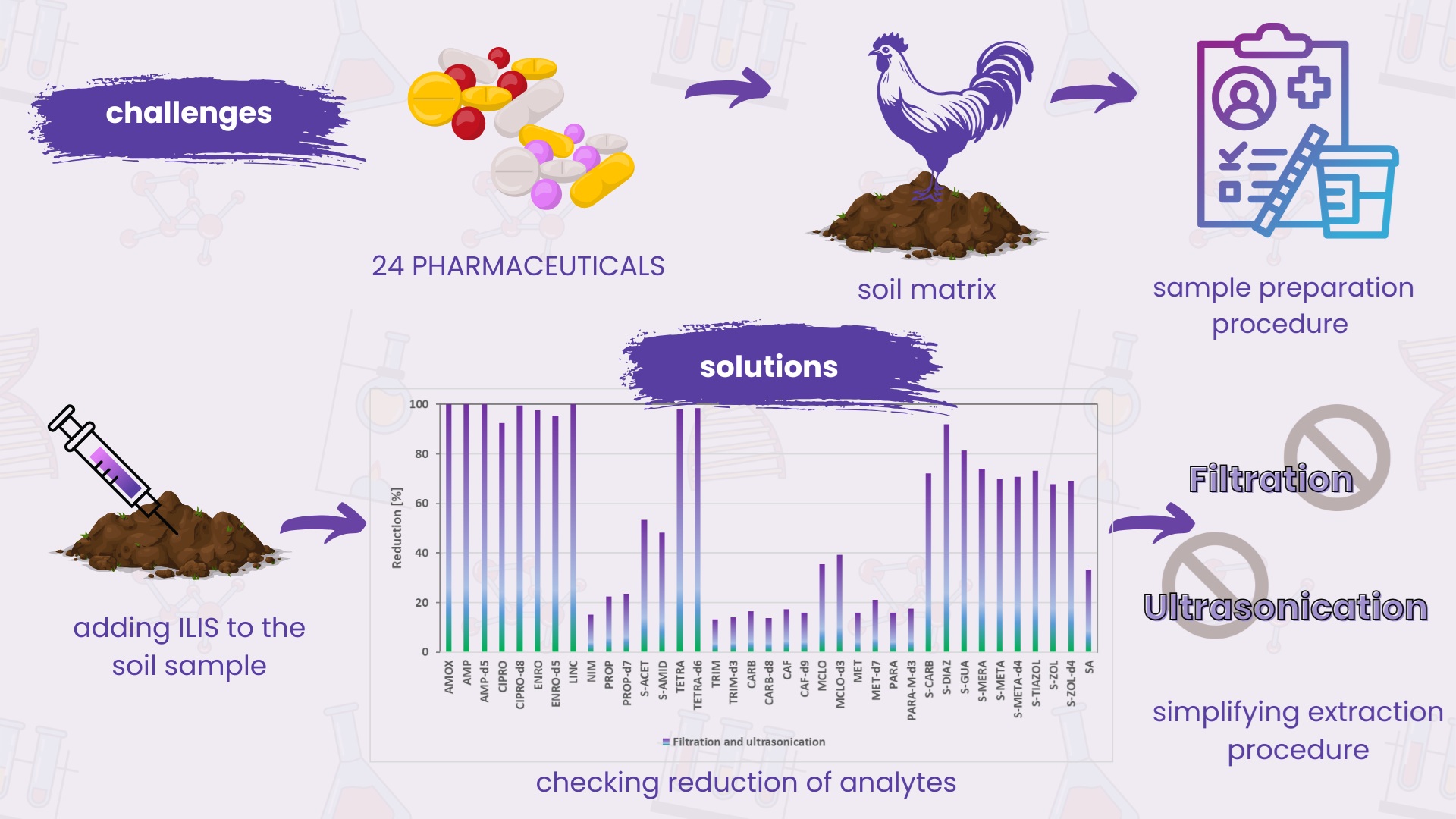The determination of trace levels of pharmaceuticals in complex environmental samples requires an appropriate sample preparation stage prior to final determination. Currently, special attention should be paid to pharmaceuticals extensively used on industrial farms due to their possible emission into the soil environment, which has become a public health concern. The greatest challenge in such sample analyses lies in selecting the appropriate analyte extraction procedure. To address these challenges, five sample preparation procedures were evaluated for the determination of 24 pharmaceuticals, aiming to compare analyte recovery. We focused on commonly used stages of the procedure, such as ultrasonication and filtration, to minimize potential analyte loss. Our results indicate that some compounds can be eliminated even up to 100% (including amoxicillin, ampicillin, and lincomycin) during ultrasonication and/or filtration. The selected procedure allowed for the improvement of the recovery value in the case of 15 pharmaceuticals in comparison with the primary method. Consequently, the proposed procedure was applied to analyze environmental soil samples from the area surrounding a poultry farm. This study demonstrates that even problematic compounds, despite their low recovery, can be analyzed by the addition of isotopically labelled internal standards with acceptable accuracy. This finding is particularly important for environmental monitoring, where trace-level detection of pharmaceutical residues is often challenged by matrix complexity and analyte instability.
