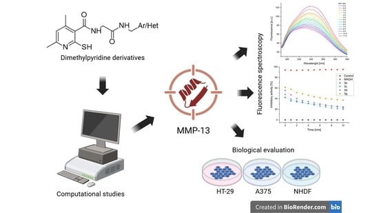 A series of dimethylpyridine-3-carboxamide derivatives was designed as potential, selective, non-zinc chelating inhibitors of matrix metalloproteinase 13 (MMP-13), and subsequently synthesized. The identity of the obtained compounds was confirmed by FT-IR, 1H/13C NMR, and HR-MS methods. Fluorescence spectroscopy was applied to study the interaction of synthesized compounds with human serum albumin, providing insight into their potential transport properties in plasma. In parallel, the electronic properties and reactivity parameters relevant to enzyme binding of the designed molecules were analyzed using density functional theory. Molecular docking and molecular dynamics simulations revealed the compounds to interact preferentially and stably within the S1 pocket of MMP-13 via hydrogen bonds and π-stacking interactions. The calculated binding free energy confirmed the stability and persistence of the complexes during simulation, indicating a strong and specific recognition pattern. On the other hand, their affinity towards MMP-8 was considerably weaker, which is consistent with the predicted selectivity profile. In addition, the biological evaluation confirmed MMP-13 inhibition. Finally, in vitro tests revealed their cytotoxic activity against cancer cell lines.