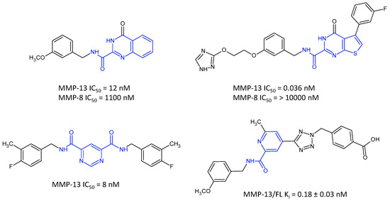 A series of dimethylpyridine-3-carboxamide derivatives was designed as potential, selective, non-zinc chelating inhibitors of matrix metalloproteinase 13 (MMP-13), and subsequently synthesized. The identity of the obtained compounds was confirmed by FT-IR, 1H/13C NMR, and HR-MS methods. Fluorescence spectroscopy was applied