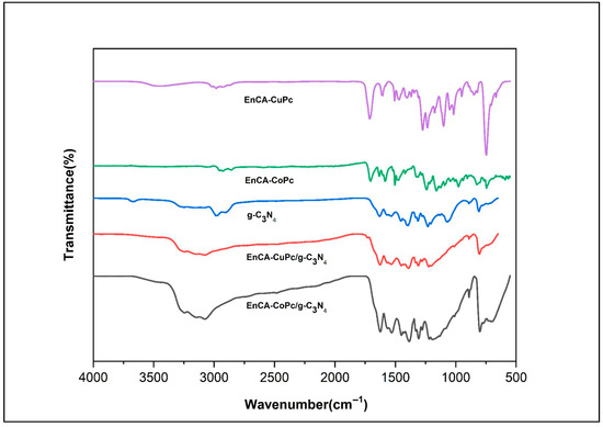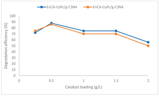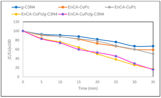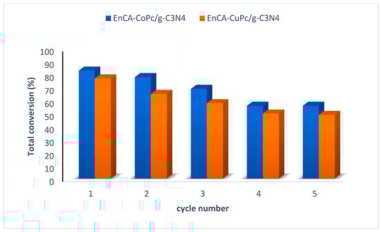 The oxidation of chlorophenolic compounds is essential for converting these persistent and toxic pollutants into less harmful products, thereby reducing their environmental and health impacts. In this study, a p-coumaric acid ester derivative was employed as the starting material to synthesize the corresponding phthalonitrile precursor (EnCA-CN), followed by the preparation of non-peripherally substituted Co(II) and Cu(II) phthalocyanine complexes (EnCA-Copc and EnCA-CuPc). These complexes were subsequently characterized using a range of spectroscopic techniques and designed to engage in π–π interactions with graphitic carbon nitride to form efficient photocatalytic materials. The structures of the two effective catalysts were characterized by FT-IR, SEM, and XRD analyses, after which their photocatalytic performance and recyclability in the degradation of 2-chlorophenol, 2,3-dichlorophenol, and 2,3,6-trimethylphenol were evaluated. The optimum catalyst loading for the MPc/g-C3N4 composites was determined to be 0.5 g/L, yielding the highest photocatalytic efficiency. The EnCA-CoPc/g-C3N4 catalyst achieved 90.8% product selectivity and 82.6% conversion in the oxidation of 2-chlorophenol, whereas the EnCA-CuPc/g-C3N4 catalyst exhibited approximately 80.0% pollutant removal. The degradation efficiencies followed the order 2-CP > 2,3-DCP > 2,3,6-TCP, with benzoquinone derivatives identified as the major oxidation products. In recyclability tests, both catalysts retained more than 50% of their activity after five cycles; EnCA-CoPc/g-C3N4 maintained 68% conversion in the 5th cycle, while EnCA-CuPc/g-C3N4 retained 60% conversion in the 4th cycle.