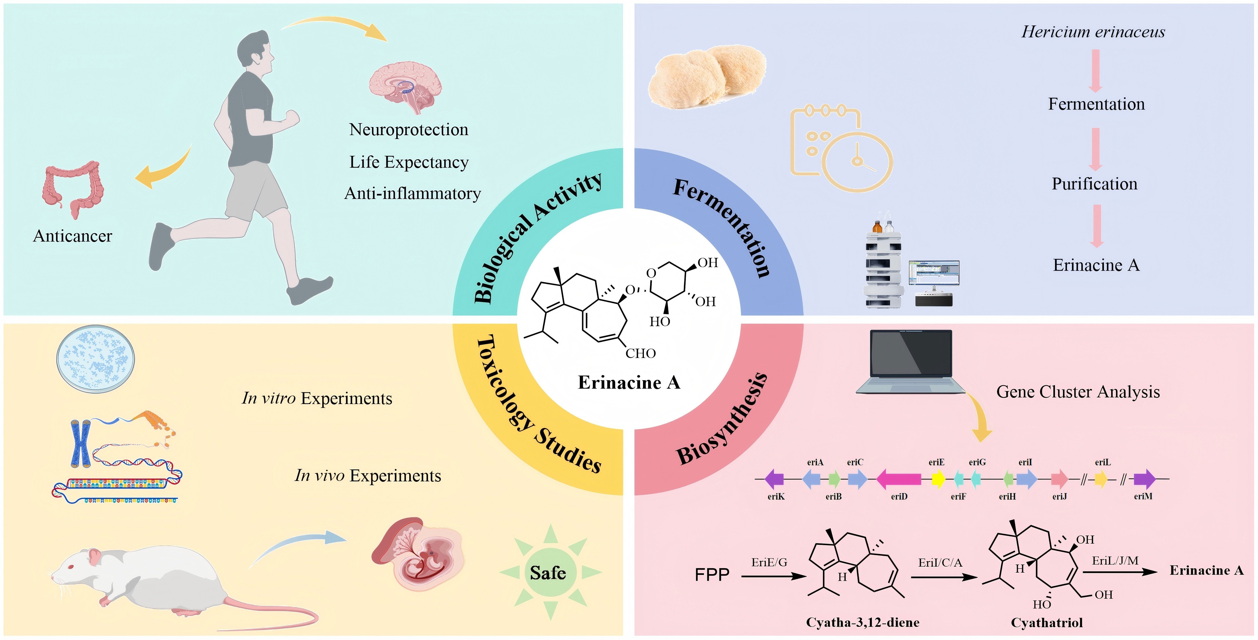 Erinacine A, a cyathane diterpenoid derived from the medicinal and edible fungus Hericium erinaceus, is increasingly recognized for its potent neurotrophic and neuroprotective properties. It demonstrates significant therapeutic promise for neurodegenerative disorders, such as Alzheimer’s and Parkinson’s disease, primarily by stimulating the synthesis of nerve growth factor (NGF). However, the clinical applicability of erinacine A is currently restricted by its low yield from natural sources and high production costs. This challenge has spurred significant research focused on optimizing its production. This review provides a comprehensive overview of the current advancements in the fermentation-based preparation of erinacine A, including both liquid and solid-state cultivation techniques. Furthermore, we summarize its diverse biological activities, spanning neuroprotection, anticancer, and anti-inflammatory effects, and detail the recent discoveries elucidating its complex biosynthetic pathway. This consolidated overview offers insights into strategies for enhancing its production and supports its ongoing development as a therapeutic agent.
