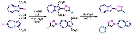 We developed an efficient and modular route to 2- and 6-(1,2,3-triazol-1-yl)azulenes to expand the synthetic accessibility and functional scope of azulene-based π-systems with stimulus-responsive photophysics. Readily accessible 2- and 6-azidoazulenes, prepared in excellent yields via SNAr reactions of haloazulenes, were subjected