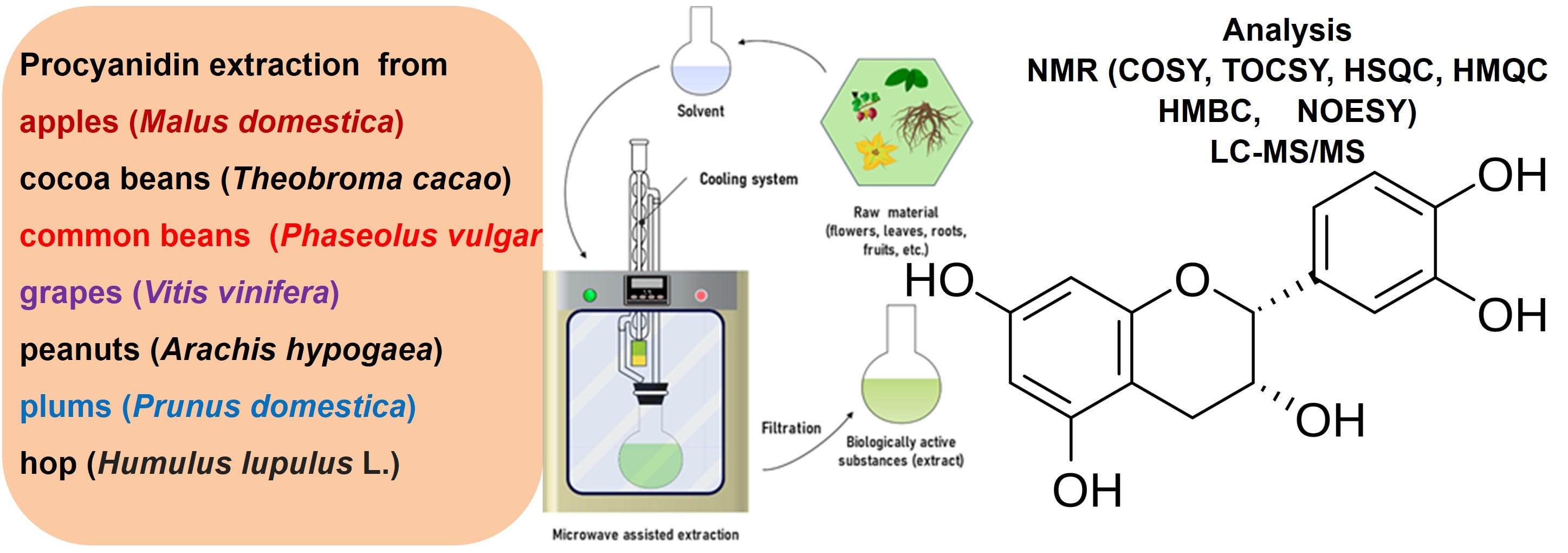 Procyanidins, a class of substances widely distributed in nature, have attracted the attention of the scientific community due to their bioactive properties, especially with regard to human health. This review is based on an extensive examination of peer-reviewed literature, patents, and clinical trial reports published between 2005 and 2025. From an initial pool of more than 300 documents, 283 studies were selected according to criteria of scientific rigor, methodological clarity, and relevance to the research objectives. A literature search was performed using PubMed, PubChem, Google Scholar, Scopus and ResearchGate employing keywords such as Procyanidins, chemical structure, extraction, and health effects. This article provides a comprehensive overview of current methods for obtaining these compounds, which include both natural sources and synthetic approaches. It provides a concise summary of the molecular structure of procyanidins and emphasizes the importance of understanding their conformational features for predicting biological activity. The challenges of establishing correlations between the structural features of procyanidins and their properties are described. In addition, this article explores the many potential applications of these compounds, spanning both biochemistry and the field of design and synthesis of novel materials. This review provides a comprehensive evaluation of Procyanidins, focusing on their geometrical conformation analysis through advanced NMR spectroscopy techniques including homonuclear correlation (COSY, TOCSY), heteronuclear one-bond (HSQC, HMQC), multiple-bond (HMBC) experiments, and through-space correlation (NOESY) in conjunction with various extraction methodologies.