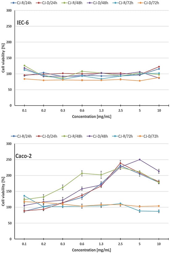 The purpose of this study was to characterise the effect of cranberry (Vaccinium macrocarpon) juice on unicellular and multicellular systems, specifically food spoilage yeasts (Wickerhamomyces anomalus, Dekkera bruxellensis and Rhodotorula mucilaginosa) and intestinal cells (IEC-6 and Caco-2 cells).