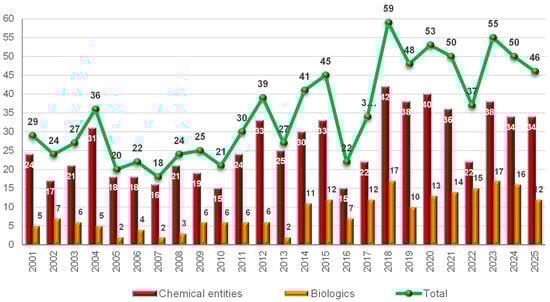In 2025, the U.S. Food and Drug Administration (FDA) approved 44 new drugs, reflecting a slight decrease compared to previous years but maintaining the overall trends in pharmaceutical innovation. Biologics accounted for 25% of approvals, including nine monoclonal antibodies (mAbs), two antibody–drug conjugates