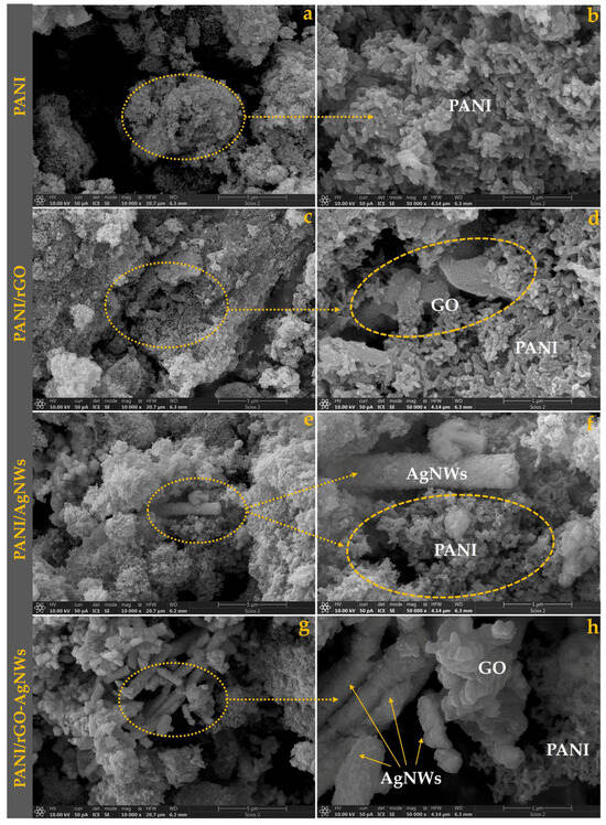 The present study explores the comparative influence of reduced graphene oxide (rGO), silver nanowires (AgNWs), and their hybrid rGO–AgNWs on the electromagnetic interference (EMI) shielding performance of polyaniline (PANI)-based flexible films prepared using a polycaprolactone (PCL) matrix. The nanocomposites were synthesized through in