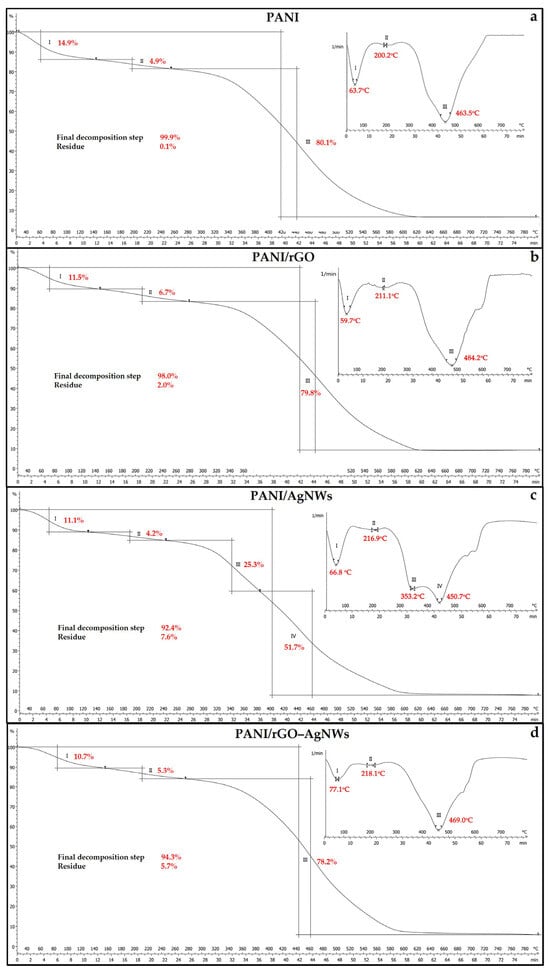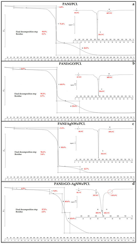 The present study explores the comparative influence of reduced graphene oxide (rGO), silver nanowires (AgNWs), and their hybrid rGO–AgNWs on the electromagnetic interference (EMI) shielding performance of polyaniline (PANI)-based flexible films prepared using a polycaprolactone (PCL) matrix. The nanocomposites were synthesized through in situ oxidative polymerization of aniline in the presence of individual or hybrid fillers, followed by their dispersion in the PCL matrix and casting of the corresponding films. Morphological and structural characterization (SEM, Raman, and FTIR spectroscopy) confirmed a uniform PANI coating on both rGO sheets and AgNWs, forming hierarchical 3D conductive networks. Thermal (TGA) and thermomechanical (TMA) analyses revealed enhanced thermal stability and stiffness across all composite systems, driven by strong interfacial interactions and restricted polymer chain mobility. Tmax increased from 437.9 °C for neat PCL to 487.9 °C for PANI/PCL, 480.6 °C for PANI/rGO/PCL, 499.4 °C for PANI/AgNWs/PCL and 495.0 °C for the hybrid PANI/rGO–AgNWs/PCL film. The gradual decrease in contact angle following the order PANI/AgNWs/PCL < PANI/rGO–AgNWs/PCL < PANI/rGO/PCL < PANI/PCL < PCL clearly indicates a systematic increase in surface polarity and surface energy with the incorporation of conductive nanofillers. Electrical conductivity reached 60.8 S cm−1 for PANI/rGO/PCL, gradually decreasing to 27.4 S cm−1 for PANI/AgNWs/PCL and 22.1 S cm−1 for the quaternary hybrid film. The EMI shielding effectiveness (SET) measurements in the X-band (8–12 GHz) demonstrated that the PANI/rGO/PCL film exhibited the highest attenuation (~7.2 dB). In contrast, the incorporation of AgNWs partially disrupted the conductive network, reducing SE to ~5–6 dB. The findings highlight the distinct and synergistic roles of 1D and 2D fillers in modulating the electrical, thermal, and mechanical properties of biodegradable polymer films, offering a sustainable route toward lightweight, flexible EMI shielding materials.