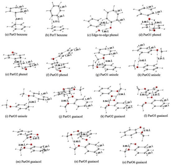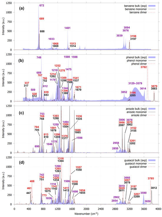 Noncovalent interactions are key to the stability of lignin dimers, the primary components of bio-oil. However, their specific influence on the infrared spectra remains poorly understood. Using dispersion-corrected density-functional theory (APFD/6-311++G(d,p)), we conducted a comparative analysis of the structures and infrared spectra of four lignin derivatives—benzene, phenol, anisole, and guaiacol—as monomers and dimers. Our study reveals that distinct vibrational shifts and newly emerging peaks observed in the calculated infrared spectra of the dimers can be attributed to the formation of σ···π and π···π stacking, hydrogen bonding, attractive van der Waals, and steric repulsion interactions. We extended the study to 3,3′-dimethoxy-1,1′-biphenyl-2,2′-diol, a guaiacyl moiety with a C–C linkage. The results indicate that the structure in which both guaiacol units adopt an anti–syn conformation is more stable—minimizing steric repulsion between hydroxyl groups—than configurations in which one guaiacol unit adopts either anti–anti or gauche–anti conformation. These differences are clearly reflected in their distinctive infrared spectral signatures.