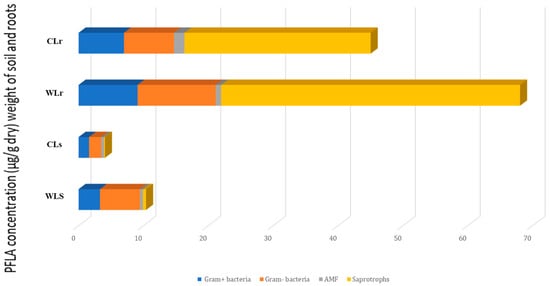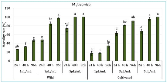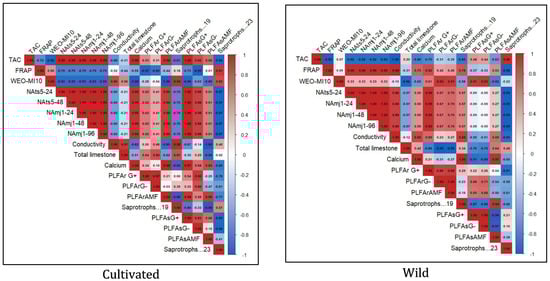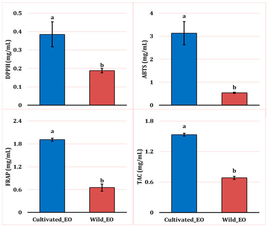 To ensure the preservation and sustainable use of Lavandula dentata L., we examined the impact of various growth conditions on the composition of essential oils extracted from the leaves of both cultivated and wild L. dentata. Additionally, we assessed the biological activities of these essential oils, along with the biomass of the root and soil microorganisms. Gas chromatography analysis revealed 21 and 23 components in the EO of the wild and cultivated plants, accounting for over 98% of the total composition in both cases. The major compounds of wild EO were borneol (49.47%), eucalyptol (23.01%), β-pinene (3.95%), β-eudesmol (3.79%), and myrtenol (3.61%). In contrast, the EO extracted from cultivated plants was characterized by a high content of borneol (32.83%), isobornyl acetate (24.45%), eucalyptol (14.71%), and α-pinene (5.83%). Unique compounds were found in wild and cultivated EO, such as linalool, cis-verbenol, carveol, α-selinene, and terpinyl acetate or tricyclene, d-limonene, camphene hydrate, and isobornyl acetate, respectively. PLFA analysis revealed a higher microbial biomass in both soil (10.393 µg/g) and the roots (68.04 µg/g) of the wild plants compared to the cultivated ones (3.91 µg/g in soil and 62.04 µg/g in roots), driven especially by Gram-negative bacteria in soil, and by saprotrophic fungi in the roots. The biological activities of the essential oils showed some variations with growth conditions, with the wild EO generally exhibiting slightly higher antibacterial, antifungal, antioxidant, and nematicidal activities in certain assays. Overall, our findings indicate that the essential oils from wild and cultivated L. dentata exhibit comparable biological value, although some differences were observed. In particular, the wild EO tended to show significantly higher biological activities in certain assays, which may be associated with its distinct chemical composition and growth environment. However, these differences were moderate and not consistently significant across all tests. Therefore, properly managed cultivation can be a dependable alternative for producing L. dentata essential oil, helping to reduce pressure on natural populations.