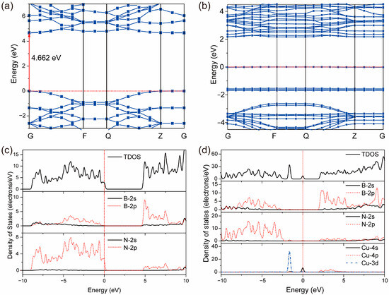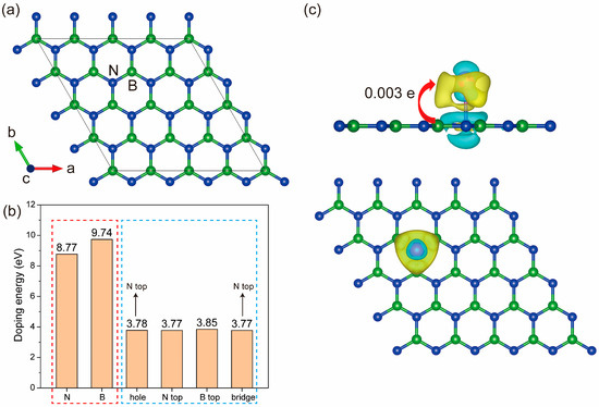 Nitrate (NO3−), as a stable nitrogen-containing compound, has caused serious harm to the ecological environment and human health. To reduce nitrate pollution, the catalytic reduction of nitrate (NO3RR) to ammonia (NH3) is a very promising solution. Recently, single-atom catalysts (SACs) have received extensive attention due to their excellent activity and stability. Here, we study the nitrate catalytic reduction properties of hexagonal-boron-nitride-(h-BN)-supported single-atom Cu systematically and theoretically and compare it with monolayer h-BN. We find that (1) due to the stronger electronegativity of the N atom, Cu atom is preferentially doped at the N top site, resulting in the significant electron rearrangement; (2) the doped Cu atom at the N top site for monolayer h-BN can provide extra 3d-orbital electrons at the Fermi level, which can significantly enhance the conductivity, reduce the bandgap width, and increase the reducibility; (3) the NO3− ion preferentially adsorbs at the hollow site of monolayer h-BN, while the NO3− ion is adsorbed more strongly at the Cu top site of h-BN-supported single-atom Cu due to the abundant d-electron supply from the Cu atom; (4) single-atom Cu can significantly reduce the energy barrier of the rate-determining step (RDS) and increase the probability of nitrate reduction. In conclusion, h-BN-supported single-atom Cu exhibits excellent catalytic performance of NO3RR.