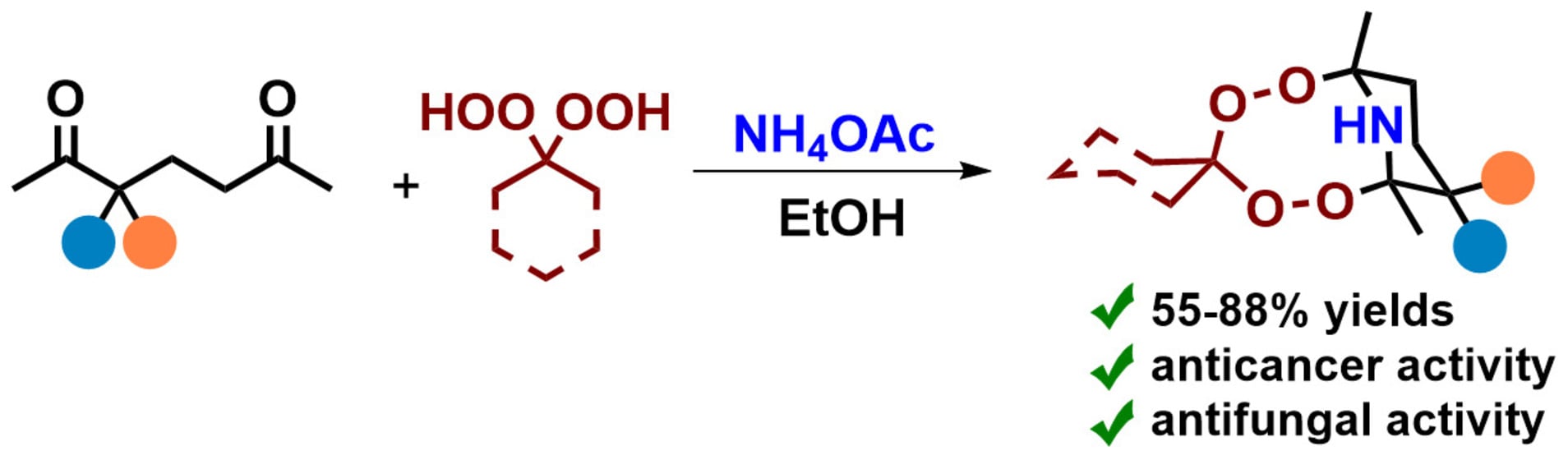 Herein, we report an efficient one-pot synthesis of bridged aminodiperoxides via a three-component reaction of 1,5-diketones with geminal bishydroperoxides and ammonium acetate. The synthesized aminodiperoxides are stable despite containing an unprotected secondary NH-group adjacent to two peroxide functionalities. Under optimal conditions, the reaction affords aminodiperoxides in high yields (up to 88%) with outstanding selectivity and high atom economy, thereby eliminating the need for column chromatographic purification. The synthesized aminodiperoxides exhibit potent cytotoxicity and remarkable selectivity toward Jurkat, K562, and A549 cancer cell lines, and are significantly superior to the clinically used anticancer agent camptothecin. Among all tested compounds, 3ec is the most promising candidate, exhibiting high activity and selectivity toward all tested cell lines (Jurkat: CC50 = 12.9 µM, SI = 67.09; K562: CC50 = 19.6 µM, SI = 44.28; A549: CC50 = 48.2 µM, SI = 17.98). Furthermore, a novel class of fungicidal compounds has been discovered. The aminodiperoxides exhibit fungicidal activity against phytopathogenic fungi, in some cases comparable to the commercial fungicide Triadimefon.