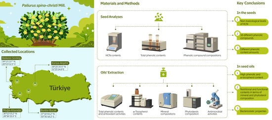 This investigation comparatively examined the toxicological, chemical, phytochemical, and antimicrobial characteristics of Paliurus spina-christi Mill. seeds and their oils collected over two consecutive years from four distinct locations in Türkiye. In the seeds, HCN levels ranged from 1.11 to 1.43 g/kg and total