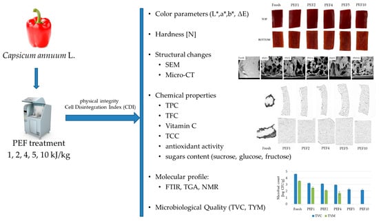 This study evaluated the energy-dependent effects of pulsed electric field (PEF) treatment on the physicochemical properties, bioactive compounds, antioxidant activity, and microstructure of red bell pepper (Capsicum annuum L.). Red bell pepper tissue was treated at specific energy inputs ranging from 1