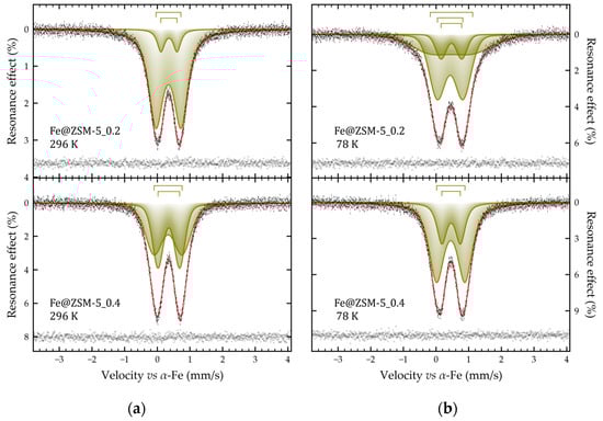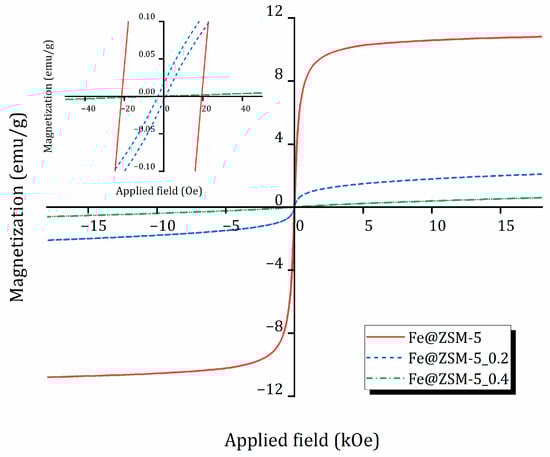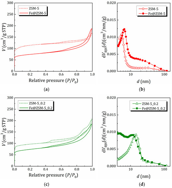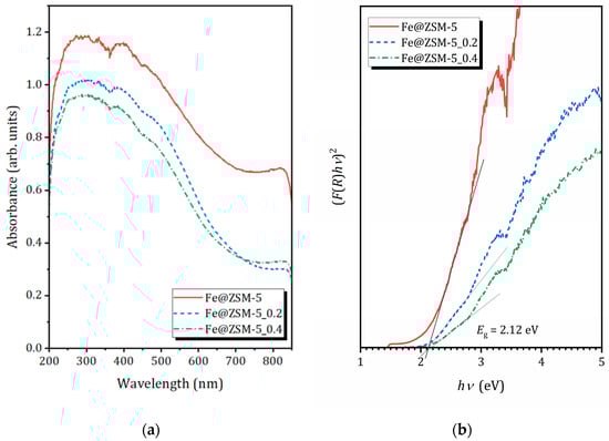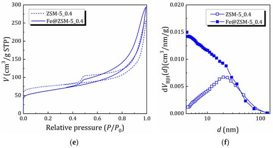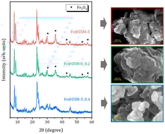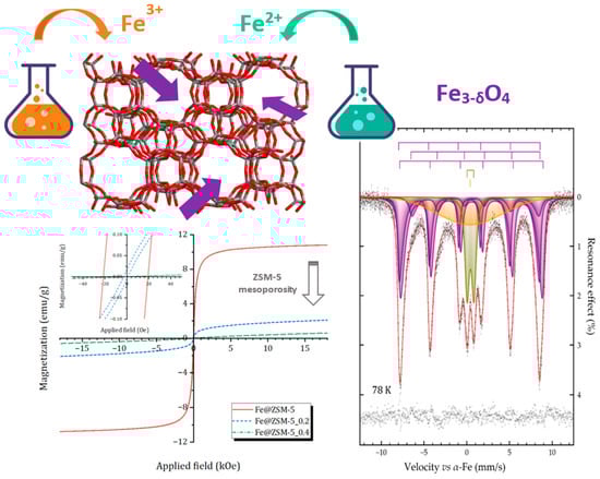 Alkaline treatment in 0.2 and 0.4 M NaOH solutions successfully generated controlled mesoporosity into ZSM-5 (Zeolite Socony Mobil-5) zeolite, resulting in average mesopore diameters of approximately 15 and 25 nm, respectively, while preserving the crystalline structure of the zeolite framework. Parent ZSM-5 and its mesoporous derivatives obtained by desilication were used to prepare (Fe species)@(zeolite matrix) composites. The synthesis was carried out by co-precipitating Fe2+/Fe3+ ions onto both parent and desilicated ZSM-5 matrices under oxygen-free conditions. Comprehensive characterization by X-ray diffraction, scanning electron microscopy, N2 adsorption, vibrating-sample magnetometry, 57Fe Mössbauer spectroscopy, and diffuse reflectance UV–Vis spectroscopy revealed that the degree of introduced mesoporosity dramatically influences the size, dispersion, phase composition, and oxidation state of the iron-containing nanospecies. On purely microporous ZSM-5, relatively large (~15 nm) partially oxidized magnetite nanoparticles are formed predominantly on the external surface, exhibiting superparamagnetism at room temperature (Mₛ = 11 emu/g) and a band gap of 2.12 eV. Increasing mesoporosity leads to progressively smaller and more highly dispersed iron(III) oxo/hydroxo clusters with significantly lower blocking temperatures and reduced magnetization (down to 0.7 emu/g for Fe@ZSM-5_0.4). All composites display strong visible-light absorption confirming their potential as magnetically separable visible-light-driven photocatalysts for environmental remediation.