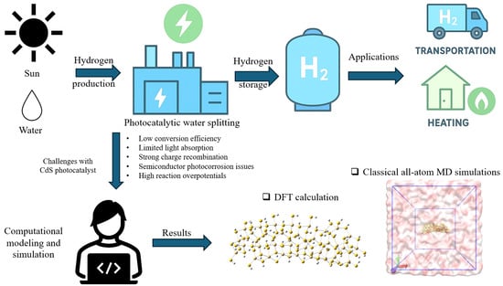 Understanding the atomic-level behavior of photocatalysts under hydrated conditions is essential for improving hydrogen production efficiency. In this work, density functional theory calculations and classical all-atom molecular dynamics simulations were performed to investigate the intra- and intermolecular interactions of rod- and cluster-shaped cadmium sulfide in the presence of implicit and explicit water, respectively. The density functional theory optimized geometries, reduced density gradient, noncovalent interaction, critical point, and molecular electrostatic potential maps were examined using the LC-ωPBE functional with the LANL2DZ basis set and the IEFPCM implicit solvation model, while explicit hydration was modeled via classical all-atom molecular dynamics simulations by obtaining molecular snapshots and radial distribution functions. Density functional theory results revealed that rod-shaped cadmium sulfide exhibits stronger directional bonding and higher electronic localization compared to cluster-shaped cadmium sulfide, while classical all-atom molecular dynamics simulations showed that water molecules preferentially interact with surface S atoms of cadmium sulfide sites. This atomistic insight clarifies how morphology and hydration jointly modulate cadmium sulfide electronic structure and reactivity, providing guidance for the rational design of efficient cadmium sulfide-based photocatalysts for solar-driven water splitting.
