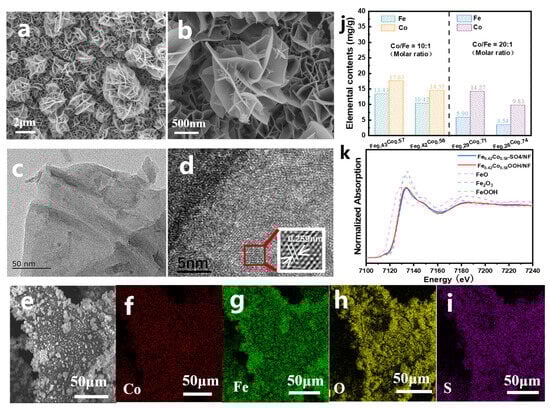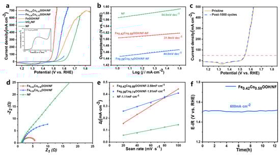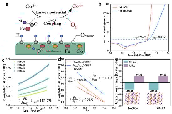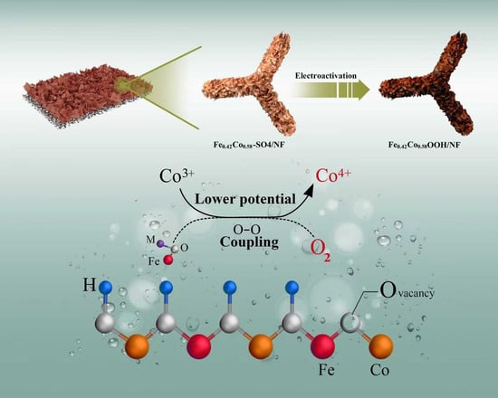 The oxygen evolution reaction (OER) in water splitting involves complex multi-electron–proton transfer processes and represents the rate-determining step limiting overall electrolysis efficiency. Developing non-noble-metal catalysts with high activity and stability is therefore essential. Herein, a heterogeneous synthesis strategy was employed to in situ construct an iron-rich layered sulfate precursor (Fe0.42Co0.58-SO4/NF) on nickel foam, which underwent deep self-reconstruction in alkaline electrolyte to form nanoflower-like Fe0.42Co0.58OOH/NF. The optimized catalyst maintained its iron-rich composition and hierarchical structure, delivering outstanding OER performance with an overpotential of 220 mV at 10 mA·cm−2, a Tafel slope of 31.9 mV·dec−1, and stability exceeding 12 h at 600 mA·cm−2. Synchrotron analyses revealed dynamic transitions between mono-μ-O and di-μ-O Fe–M (M = Fe, Co) oxygen bridges during reconstruction, which enhanced both structural robustness and active-site density. The Fe-rich environment promoted the formation of Fe3+–O–Fe3+ units that synergized with Co4+ species to activate the lattice oxygen mechanism (LOM), thereby accelerating OER kinetics. This work elucidates the key role of oxygen-bridge geometry in optimizing catalytic activity and durability, providing valuable insights into the rational design of Fe–Co-based non-noble-metal catalysts with high iron content for efficient water oxidation.