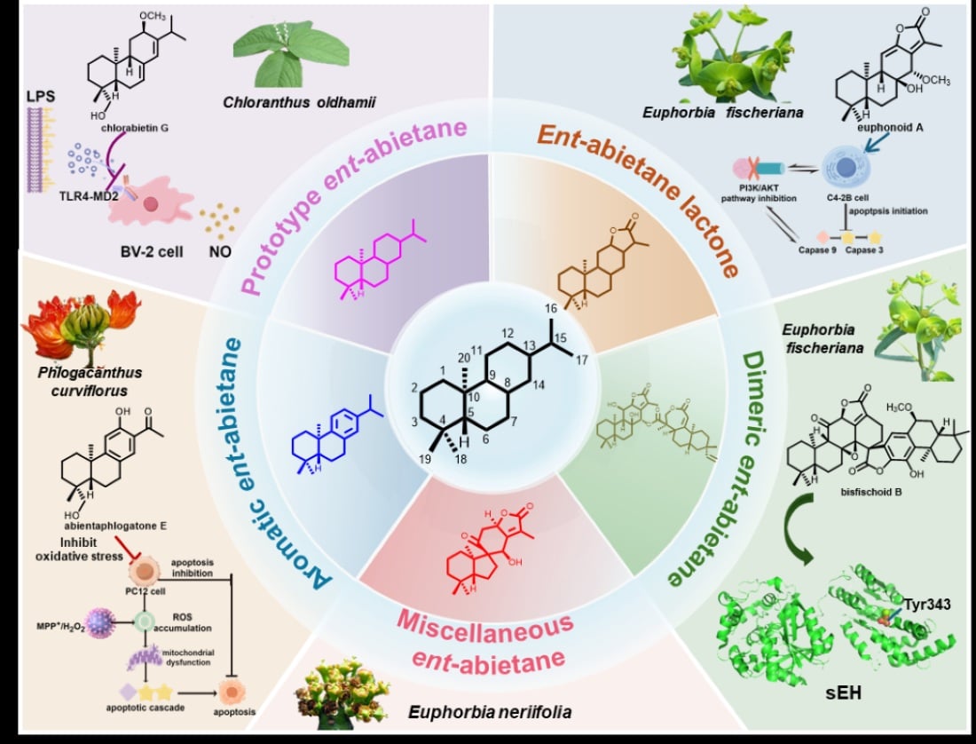Ent-abietane diterpenoids constitute a class of terpenes with a C20 carbon skeleton that underlie a wide range of biological activities. Ent-abietane diterpenoids, enantiomeric to the abietane counterparts, represent a family of diterpenoid natural products characterized by their distinct