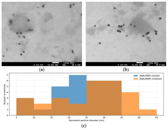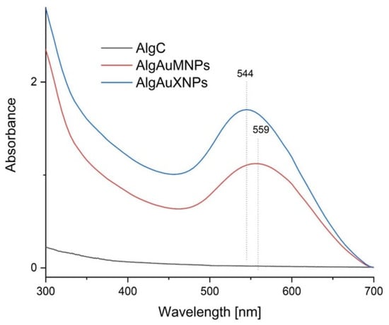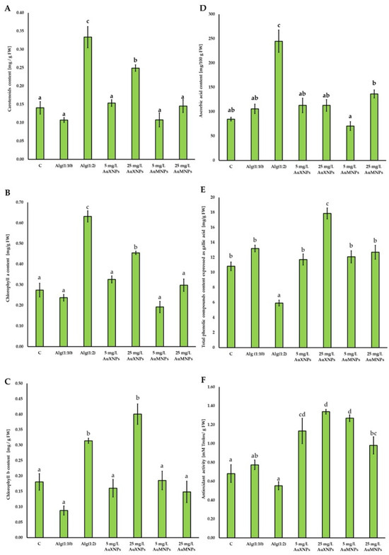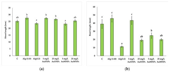 Gold nanoparticles (AuNPs) have numerous applications in science and industry. Therefore, their potential phytotoxicity should be investigated. Garden cress (Lepidium sativum L.) is a useful model plant for assessing the effects of chemicals released into the environment. The aim of this study was to prepare alginate gels containing AuNPs for plant exposure experiments, evaluate their physicochemical properties, and determine their effects on selected biochemical parameters of garden cress seedlings. Gold nanoparticles were synthesized in sodium alginate at an initial concentration of 50 mg/L, using xylose and maltose as reducing agents. The gels were diluted with distilled water to obtain AuNP concentrations of 5 and 25 mg/L. Garden cress seeds were placed on filter paper soaked with the tested formulations, while distilled water and sodium alginate solutions without AuNPs served as controls. After 5 days of incubation at 20 °C under light conditions, the plant material was collected and selected bioactive compounds were determined. AuNP-containing gels significantly affected the biochemical status of the seedlings. In particular, AuNPs synthesized with xylose at 25 mg/L significantly increased the contents of photosynthetic pigments and total polyphenolic compounds. All tested AuNP formulations increased the antioxidant activity of seedlings, suggesting the activation of abiotic stress-related defense responses, however, direct markers of oxidative damage were not assessed in the present study. Overall, the results indicate that alginate-based AuNPs can modify selected biochemical parameters in garden cress seedlings, and these effects depend on nanoparticle concentration and reducing sugar used during synthesis, which may be relevant for the future development of plant-targeted nanomaterials for agricultural applications.