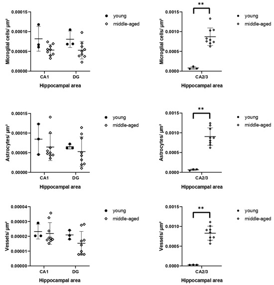 Introduction: This study investigates how early aging affects the rat brain, focusing on aquaporin-4 and IL-17 levels in the whole brain, as well as glial cell alterations in the hippocampus. The hippocampus, essential for learning and memory, undergoes age-related changes contributing to cognitive decline and neuroinflammation. Glial cells—particularly microglia and astrocytes—are central to these processes. Most research focuses on advanced aging; in this study, we examine early aging effects. Methods: Male Wistar rats (13 weeks and 13 months old) were used. Whole-brain IL-17 and aquaporin-4 levels were assessed by ELISA. Immunohistology targeting GFAP, Iba1, and CD31 was performed on hippocampal sections to assess glial and vascular changes in CA1, CA2/3, and the dentate gyrus (DG). Results: Middle-aged rats brains showed significantly higher IL-17 and aquaporin-4 levels, confirming low-grade inflammation and metabolic alteration. In the hippocampus, microglia, astrocytes, and cerebral microvessels increased in CA2/3, with no significant changes in CA1 or DG. Conclusions: Early aging induces whole-brain neuroinflammation and metabolic changes and region-specific hippocampal alterations, with CA2/3 being particularly susceptible. These findings advance understanding of early brain aging and highlight CA2/3 as a potential target for intervention.