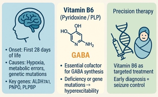 Background: Neonatal seizures are critical neurological events with long-term implications for brain development. Standard antiseizure medications, such as phenobarbital, often yield suboptimal seizure control and may be associated with neurotoxicity. This narrative review explores the role of vitamin B6 as a precision therapy in neonatal seizure syndromes, particularly in pyridoxine-responsive conditions. Methods: We conducted a narrative review of the biochemical functions of vitamin B6, focusing on its active form, pyridoxal 5′-phosphate (PLP), and its role as a coenzyme in neurotransmitter synthesis. We examined the genetic and metabolic disorders linked to vitamin B6 deficiency, such as mutations in pyridox(am)ine 5’-phosphate oxidase (PNPO), Aldehyde Dehydrogenase 7 Family Member A1 (ALDH7A1), alkaline locus phosphatase (ALPL), and cystathionine β-synthase (CBS), and discussed the clinical rationale for empirical administration in acute neonatal seizure settings. Results: Vitamin B6 is essential for the synthesis of gamma-aminobutyric acid (GABA), dopamine, and serotonin, with PLP-dependent enzymes such as glutamic acid decarboxylase and aromatic L-amino acid decarboxylase playing central roles. Deficiencies in PLP due to genetic mutations or metabolic disruptions can result in treatment-resistant neonatal seizures. Early supplementation, especially in suspected vitamin B6-dependent epilepsies, may provide both diagnostic clarity and seizure control, potentially reducing exposure to conventional antiseizure medications. Conclusions: Vitamin B6-responsive epilepsies highlight the clinical value of mechanism-based, individualized treatment approaches in neonatology. Incorporating genetic and metabolic screening into seizure management may improve outcomes and aligns with the principles of precision medicine.
