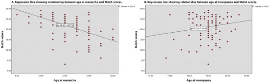 Background: Parkinson’s disease (PD) is a neurodegenerative disorder affecting men more frequently than women, a difference that might be due to many factors, including sexual hormones. Estrogens seem to confer a protective effect on the nigrostriatal pathway in experimental studies but their effects on cognition in patients with PD are unknown. Aim: To investigate the impact of the exogenous and endogenous estrogens on cognitive impairment in women with PD. Methods and materials: We recruited and consecutively interviewed outpatient women affected by PD. Each patient underwent a cognitive assessment via the Montreal Cognitive Assessment scale (MoCA), an anamnestic collection of the reproductive lifespan variables and clinical features. We investigated if some of the reproductive lifespan variables investigated could predict cognition outcomes in post-menopausal women with PD. Results: A total of 90 women with PD were recruited. Women with MoCA ≥ 26 (n = 27) had a lower median age at menarche (11 [11,12] vs. 13 [12–14], p < 0.0001), lower disease duration in years (8.3 [6.1–12.7] vs. 9.4 [6–12.7], p = 0.6), and less advanced disease (1 [1,2] vs. 2 [1–3], p = 0.02). Among all the reproductive life-span variables, only earlier age at menarche significantly predicted higher scores on MoCA (aOR = 0.5 [0.3–0.8], p = 0.005). No other clinical and reproductive factors have been shown to have an influence on cognitive scores. Conclusions: Age at menarche correlated with cognitive outcomes. Our study suggests that earlier exposure to endogenous estrogens during a phase of development and plasticity of the brain might preserve women with PD from cognitive decline.