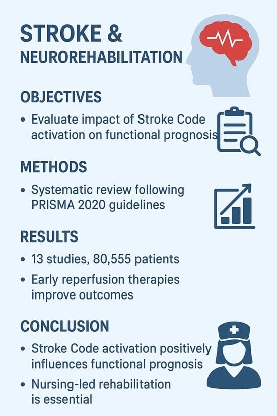 Introduction: Stroke is one of the leading causes of death and disability worldwide. In this context, early activation of the Stroke Code and a structured neurorehabilitation approach are key determinants of patients’ functional outcomes. Objectives: We aimed to evaluate the impact of Stroke Code activation on the functional prognosis of patients who have suffered an ischemic stroke, analyzing the time-dependent relationship and the effectiveness of reperfusion therapies. Additionally, we sought to examine the role of nursing in inpatient neurorehabilitation. Methods: A systematic review was conducted following the PRISMA 2020 guidelines. Scientific studies published between 2020 and 2025 were reviewed across five databases: PubMed; Cochrane Library; Dialnet; Web of Science; and Scopus. Eligibility criteria were applied, and validated tools were used to assess methodological quality and risk of bias. Results: Thirteen studies were included, involving a total sample of 80,555 patients. Age; lesion volume; and time to treatment were found to be key prognostic factors. Early implementation of reperfusion therapies (thrombolysis and/or thrombectomy), combined with nursing-led neurorehabilitation interventions, significantly improved neurological status, functional independence, and quality of life. Conclusions: Stroke Code activation has a significant positive influence on functional prognosis. Reducing treatment delays and optimizing reperfusion therapies are critical. Furthermore, the role of nursing in hospital-based neurorehabilitation is essential to support patient recovery and functionality.