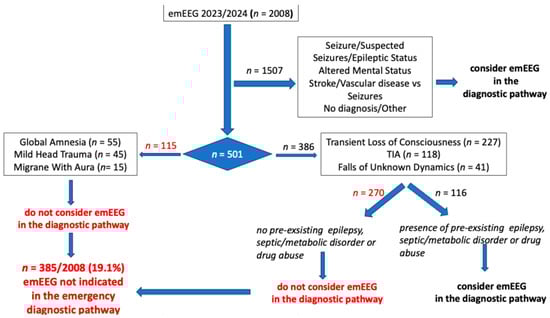 Introduction: This study was conducted to determine whether specific emergency physician (EP) diagnoses and/or neurological signs/symptoms upon admission to the Emergency Department (ED) were associated with normal/non-informative emergency electroencephalogram (emEEG). Methods: Data from consecutive patients admitted to the ED of our tertiary hospital over a two-year period (1 January 2023–31 December 2024) were analyzed retrospectively. We evaluated the correlation between normal/non-specific emEEGs and EP admission diagnoses and neurological signs/symptoms on admission. Epileptic discharges and sharp waves with triphasic morphology were considered specific patterns. Results: A total of 2008 patients underwent emEEG recording during the study period. EmEEGs were considered non-informative in 100% of global amnesia diagnoses, 100% of cases of mild head trauma, 100% of cases of migraine with aura, 98.3% of transient ischemic attacks (TIAs), 95.6% of transient losses of consciousness (TLCs) when seizure was not the primary suspected diagnosis, and in 92.7% of falls of unknown dynamics. Epileptic patterns were detected in 4% of patients presenting with TLC and in 2.4% of those with falls of unknown dynamics, with approximately half of these patients having a pre-existing diagnosis of epilepsy. Triphasic waves were detected in 4.9% patients with falls of unknown dynamics, in 1.7% with TIA, and in 0.4% with TLC. All of these patients had fever/sepsis or metabolic/electrolyte disorders. Overall, across all clinical scenarios, emEEGs were considered non-informative in 385 (19.1%) tested patients. Conclusions: emEEGs are almost non-informative in the diagnostic pathway for patients with global amnesia, mild head trauma, and migraine with aura, and in patients with TIA, TLC, or falls of unknown dynamics. EPs can safely consider avoiding emEEGs in the absence of previous epilepsy diagnosis, fever/sepsis, metabolic/electrolyte disturbances, or drug abuse.