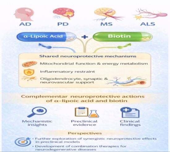 Background: Neurodegenerative diseases, including Alzheimer’s disease, Parkinson’s disease, multiple sclerosis, and amyotrophic lateral sclerosis, represent a major global health burden and share convergent pathogenic mechanisms, such as mitochondrial dysfunction, oxidative stress, neuroinflammation, calcium imbalance, and neuronal loss. Despite advances in symptomatic management, effective disease-modifying therapies remain limited. Objectives: This review aims to critically synthesize mechanistic, preclinical, and clinical evidence on α-lipoic acid and biotin as candidate neuroprotective agents in neurodegenerative diseases, with emphasis on shared signaling pathways, therapeutic potential, generally favorable safety profiles, and translational limitations. Methods: A narrative and integrative review was conducted, encompassing mechanistic studies, preclinical experimental models, and clinical trials and observational studies evaluating ALA and biotin in neurodegenerative diseases. The evidence was qualitatively analyzed with attention to biological plausibility, consistency across models, and clinical relevance. Results: ALA and biotin modulate key cellular pathways implicated in neurodegeneration, including mitochondrial metabolism, redox homeostasis, inflammatory signaling, and neurovascular function. Preclinical studies consistently report beneficial effects on mitochondrial efficiency, oxidative stress, and neuroinflammatory markers. In contrast, clinical evidence remains heterogeneous, with more extensive evaluation of biotin in progressive multiple sclerosis and more limited or exploratory findings for ALA across neurodegenerative disorders. Conclusions: ALA and biotin exhibit mechanistic convergence across pathways relevant to neurodegeneration and generally favorable safety profiles. Although current evidence supports their biological plausibility as adjunctive or exploratory therapeutic strategies, clinical outcomes remain inconsistent and appear to be influenced by dosing regimens, disease stage at intervention, and endpoint selection. Well-designed clinical studies are required to define their efficacy, optimal dosing, and disease-specific applicability.