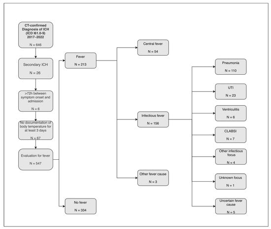 Background: Fever occurs frequently in patients with intracerebral hemorrhage (ICH) and is associated with worse functional outcomes. Rapid identification of the fever’s cause is crucial for guiding diagnostics and treatment. Data on the distribution of different fever causes in ICH are limited, and