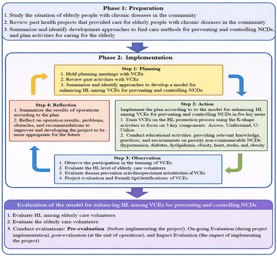 Background/Objectives: Limited health literacy among older adults with noncommunicable diseases (NCDs) remains a major challenge in community and primary-care settings. This action research aimed to develop and evaluate a community-based health literacy training model for volunteer caregivers for the elderly (VCEs) to support