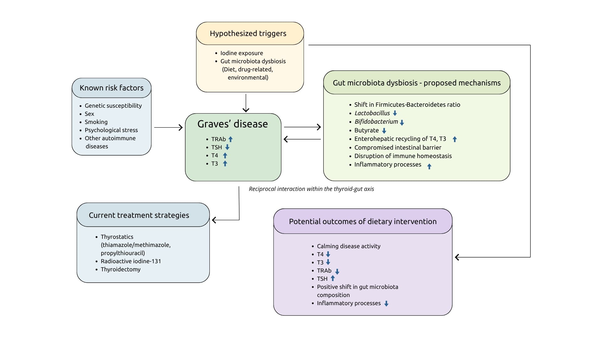Thyroid disorders are among the most common endocrine disorders worldwide and are classified as noncommunicable diseases. These disorders are associated with significant morbidity, impaired quality of life, and considerable socioeconomic burden. Like other noncommunicable diseases, thyroid disorders arise from complex interactions between genetic susceptibility and environmental factors, including diet and lifestyle. Despite growing interest in lifestyle-based approaches to noncommunicable disease prevention and management, thyroid disorders have received comparatively limited attention in this context. Graves’ disease, the most common cause of hyperthyroidism, is a relevant condition for exploring dietary interventions. Current treatment strategies—anti-thyroid drugs, radioactive iodine and thyroidectomy—have remained largely unchanged for decades. Long-term remission following drug therapy is achieved in no more than approximately 50% of patients, while all treatment modalities carry potential adverse effects. These limitations underscore the need for alternative or adjunctive therapeutic strategies. Iodine intake plays a central role in thyroid hormone synthesis. Indeed, observational studies have shown inverse associations between iodine intake and remission rates, as well as achievement of euthyroidism, medication requirements and thyroid autoantibody titers. These findings suggest that dietary iodine restriction may enhance treatment efficacy and reduce medication-related risks. Beyond its direct effects on thyroid hormone synthesis, iodine may influence Graves’ disease through indirect mechanisms involving the lipid profile and the gut–thyroid axis. Autoimmune thyroid diseases are associated with a dyslipidemic profile and with gut microbiota dysbiosis; the latter characterized by increased potentially pathogenic bacteria and reduced beneficial bacteria such as Lactobacillus and Bifidobacterium.