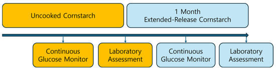 Background/Objectives: Patients with hepatic glycogen storage disease (GSD) require frequent nighttime intake of uncooked corn starch (UCCS) to prevent fasting hypoglycemia, which imposes a substantial burden. Glycosade, an extended-release cornstarch, was developed to prolong overnight glucose availability. However, data regarding South Korean patients are limited. Therefore, we aimed to evaluate the efficacy and safety of Glycosade in South Korean patients with hepatic GSD. Methods: In this single-center prospective observational study, patients with hepatic GSD underwent laboratory evaluations before and 1 month after Glycosade administration. Continuous glucose monitoring (CGM) was performed during UCCS and Glycosade administration periods. The nocturnal mean glucose, coefficient of variation, time in range (70–180 mg/dL), and time below the range (<70 and <54 mg/dL) were compared between the periods using paired analyses. Results: No significant differences were observed in the nocturnal CGM metrics between the treatment periods. However, time-aligned CGM profiles revealed distinct temporal patterns, with a decline in glucose levels approximately 3–4 h after UCCS intake, whereas Glycosade showed a more sustained glucose profile over an extended period. Liver enzyme and lipid levels improved significantly after 1 month of Glycosade supplementation. Conclusions: In a cohort of South Korean patients with hepatic GSD, Glycosade maintained nocturnal glycemic stability comparable to that of conventional cornstarch without increasing the risk of hypoglycemia. Glycosade was also associated with improved biochemical parameters, supporting its role in nighttime dietary management.