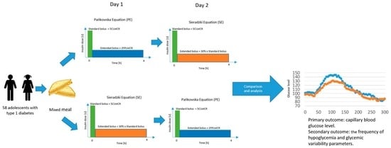 Background/Objectives: Optimal postprandial glycemic control is crucial to maintain time in range (TIR:3.9–10.0 mmol/L, 70–180 mg/dL) and time in tight range (TITR:3.9–7.8 mmol/L, 70–140 mg/dL), both important to reduce microvascular complications in type 1 diabetes mellitus (T1DM). However, insulin dosing based on carbohydrate counting fails to compensate for delayed hyperglycemia from protein and fat. This study evaluated two advanced insulin dosing algorithms designed to improve postprandial control in adolescents with T1DM. Methods: In this randomized, prospective, double-blind, crossover trial, 58 adolescents with T1DM (median age 15.5 years) were enrolled, all using continuous subcutaneous insulin infusion and a continuous glucose monitoring system in non-automated mode. For two consecutive days, participants consumed standardized mixed meals for breakfast (50 g of carbohydrates, 200 kcal from protein and fat) and received an extended bolus delivered for four hours, based on the Pankowska Equation (PE, i.e., Fat-Protein Units × Insulin-to-Carbohydrate Ratio (ICR)) and the Sieradzki Equation (SE, i.e., 30% × Carbohydrate Units × ICR). Postprandial glucose was monitored for five hours using a glucometer and Continuous Glucose Monitoring (CGM). The primary outcome was the capillary blood glucose level at predefined time points. The secondary outcomes were the frequency of hypoglycemia and glycemic variability parameters. Results: Both methods kept postprandial glucose within the recommended TIR. The SE method provided longer TITR (82.51% vs. 70.49%, p = 0.6281) and fewer hypoglycemic episodes at 180 and 300 min. Glucose levels at 60 min, were higher after PE (136 ± 35.2 mg/dL vs. 124 ± 32.2 mg/dL, p = 0.016). Conclusions: Both algorithms provided effective postprandial control after a mixed meal, but SE achieved a longer TITR and fewer late hypoglycemic events.