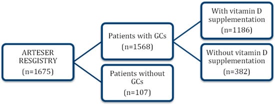 Objective: To determine whether oral vitamin D supplementation reduces the risk of glucocorticoid (GC)-associated severe adverse events (SAEs) in patients with giant cell arteritis (GCA) included in the Spanish ARTESER registry. Methods: The ARTESER registry collected data from patients diagnosed with GCA across