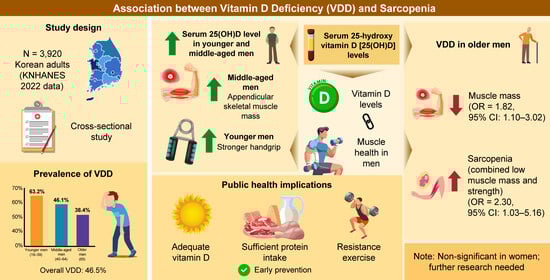 Background/Objectives: Although vitamin D has been associated with sarcopenia in older adults, evidence across age groups remains limited. This study evaluated the relationship between vitamin D deficiency (VDD) and muscle health in Korean adults aged ≥19 years. Methods: Data utilized in this study were obtained from the 2022 Korea National Health and Nutrition Examination Survey IX-1. Serum 25-hydroxyvitamin D [25(OH)D] levels were analyzed in relation to appendicular skeletal muscle mass (ASM), grip strength, and sarcopenia using multivariable regression models. Results: Among 3,920 participants, 46.5% had VDD, with the highest prevalence observed in younger adults. After adjusting for age, body mass index, energy intake, and other confounding factors, serum 25(OH)D levels showed a positive association with ASM in middle-aged men (β = 0.005; p = 0.007) and with maximal handgrip strength in young men (β = 0.097; p = 0.048). Among older men, those with VDD had significantly higher odds of low muscle mass (OR = 1.82; 95% CI: 1.10–3.02) and sarcopenia (OR = 2.30; 95% CI: 1.03–5.16) than those without VDD, after adjusting for potential confounders. No significant associations were observed in women. Conclusions: These results suggest that maintaining adequate vitamin D levels may benefit muscle health in men. Further prospective or interventional studies are needed to more accurately assess the effects of vitamin D on muscle health.