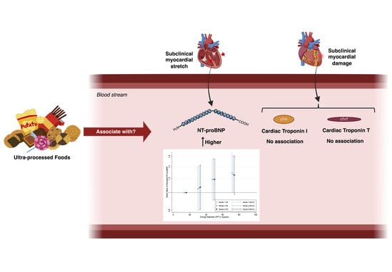 Background/Objectives: Ultra-processed food consumption has been shown to be linked with clinical cardiovascular disease. This study aims to examine the associations of ultra-processed food consumption with biomarkers for subclinical-level myocardial damage [high-sensitivity cardiac troponin I and T (hs-cTnI and hs-cTnT)] and myocardial stretch