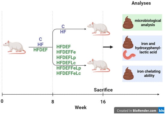 Background: Lactiplantibacillus plantarum synthesizes in vitro hydroxyphenyllactic acid (HPLA)—an iron-reducing agent supposed to facilitate duodenal Fe absorption. So far, no such in vivo HPLA production has been established. This study aimed to investigate the ability of Lactiplantibacillus plantarum to produce HPLA in the duodenum in rats on a high-fat iron-deficient diet. Methods: Rats were fed a high fat (HF) diet; HF, Fe-deficient diet (HFDEF); or control (C) diet for 8 weeks. Over the next 8 weeks, animals in the C and HF groups continued on their respective diets, while animals in the HFDEF group were divided into six subgroups and received combinations of an HF, Fe-deficient diet with Lactiplantibacillus plantarum (Lp), Latilactobacillus curvatus (Lc), and Fe supplementation (HFDEF, HFDEFFe, HFDEFLp, HFDEFLc, HFDEFFeLp, and HFDEFFeLc). Duodenal and faecal samples were collected. Results: No significant differences were observed in HPLA content in the duodenum and faeces, nor in Fe chelating abilities in faeces, between study groups at the completion of the study. Fe content in faeces was higher in the HFDEFFe group than in the C, HF, HFDEF, HFDEFLp, and HFDEFLc groups. Fe content in faeces was higher in the HFDEFFeLp and HFDEFFeLc groups than in the HFDEF and HFDEFLc groups. Conclusions: Lactiplantibacillus plantarum, whether alone or with oral Fe, does not influence duodenal and faecal HPLA content, nor does it affect faecal Fe chelating abilities in rats on the HF, Fe-deficient diet.